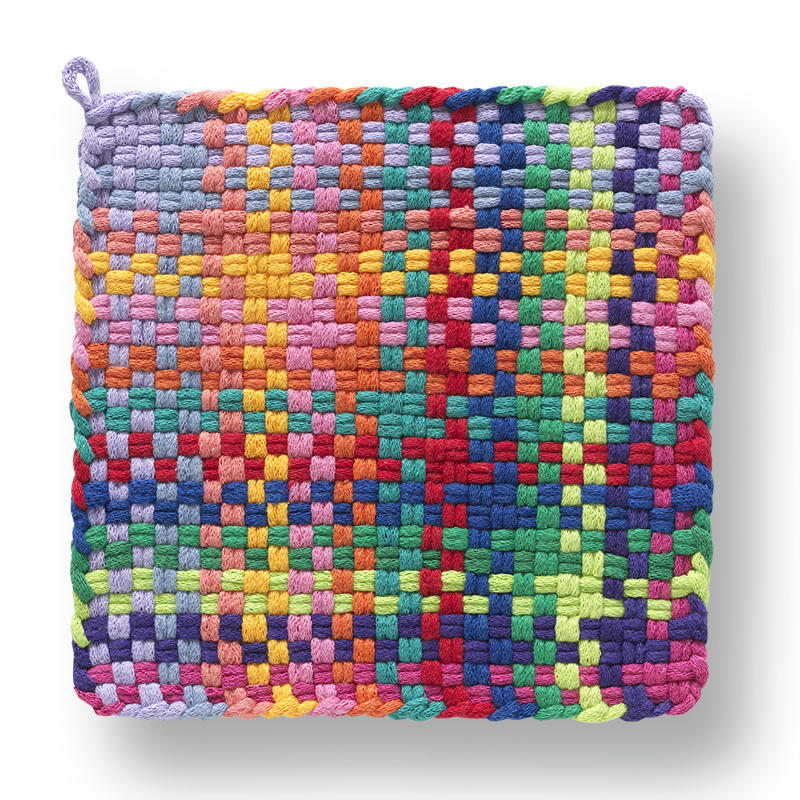 Our sturdy Potholders are made with high quality cotton. All materials are made in USA. Each one is handcrafted in Mexico and inspected for quality. Our Potholders are available in a variety of patterns in assorted Bright, Pastel and Earth-tone colors.
